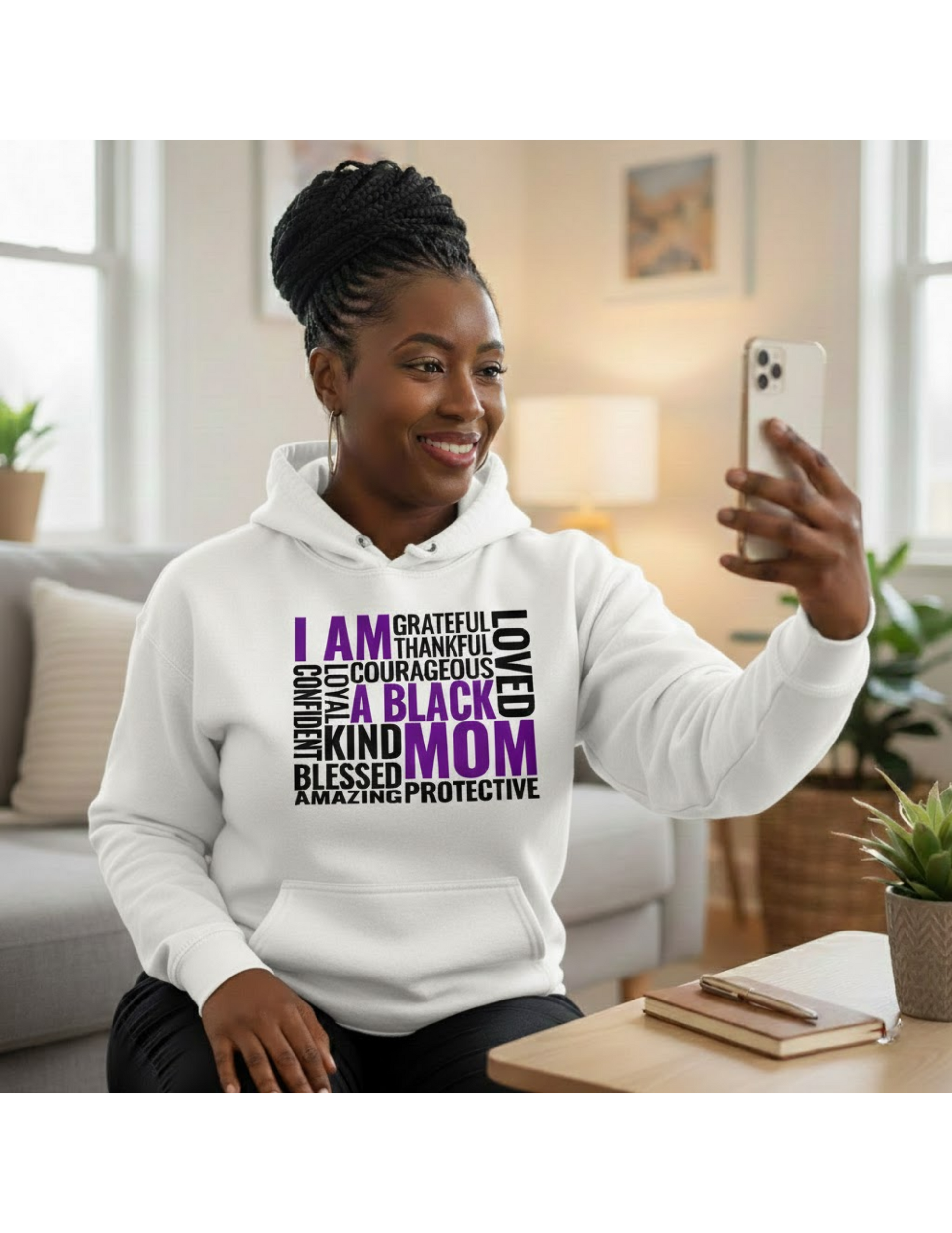 This striking design features the core message "I AM A BLACK MOM" in bold, vibrant purple lettering, beautifully woven together with powerful daily affirmations in sleek black text: Grateful, Thankful, Courageous, Loved, Confident, Loyal, Kind, Blessed, Amazing, and Protective. It is more than just a hoodie; it’s a wearable reminder of your worth and power.